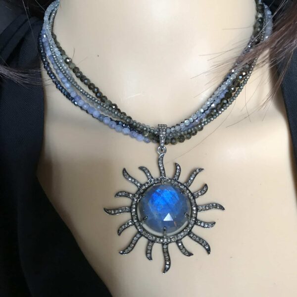 • Solar Power Necklace – 15″ to 19″ adjustable – Labradorite, Iolite, Champagne Diamonds, Pyrite, Sapphire, Spinal Choker