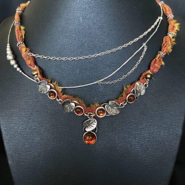 • Honey Garden Choker Necklace- 15″-17″ adjustable – Amber, Silk, Sterling Silver
