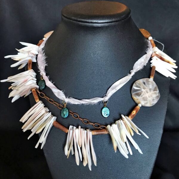 • Wild Moon Necklace- 17″ – Moonstone, Agate, Pearl, Shell, Wood, Copper, Brass