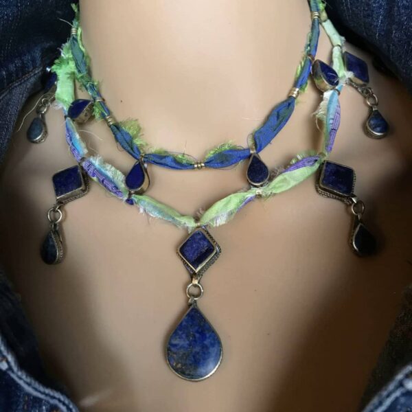 • Lapis Waterfall Necklace – 15″ – 17.5″ adjustable – Lapis, Silk, Sterling Silver