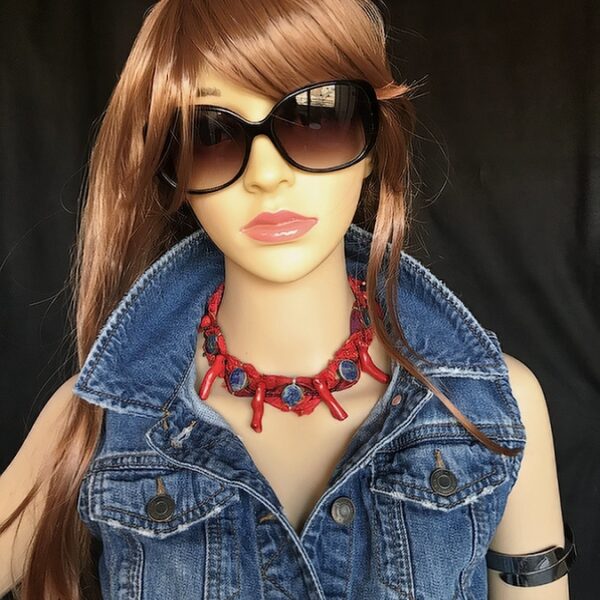 • Coral Fire Choker Necklace – 15″ – 17.5″ adjustable – Red Coral, Lapis, Silk, Sterling Silver