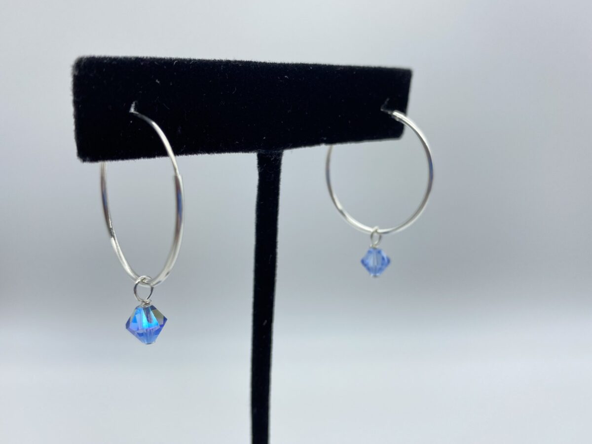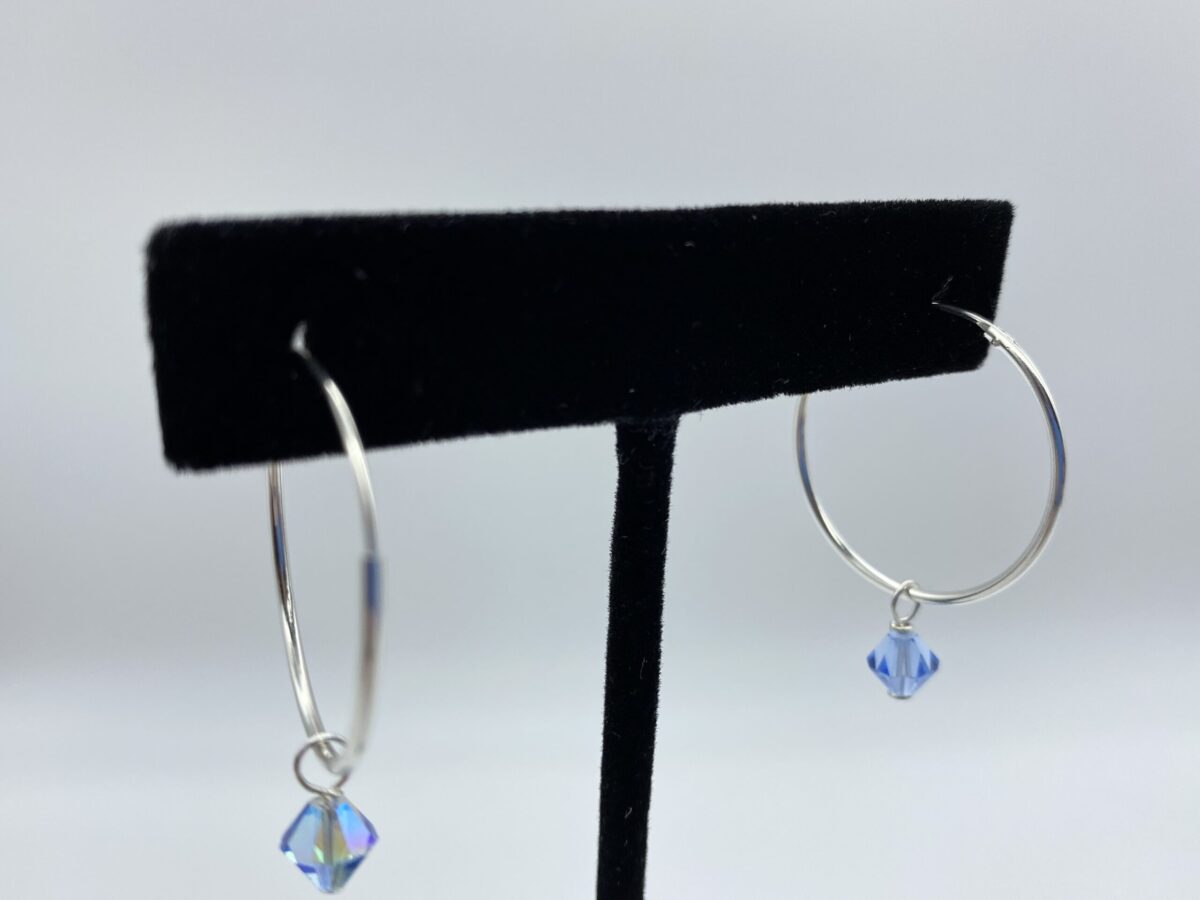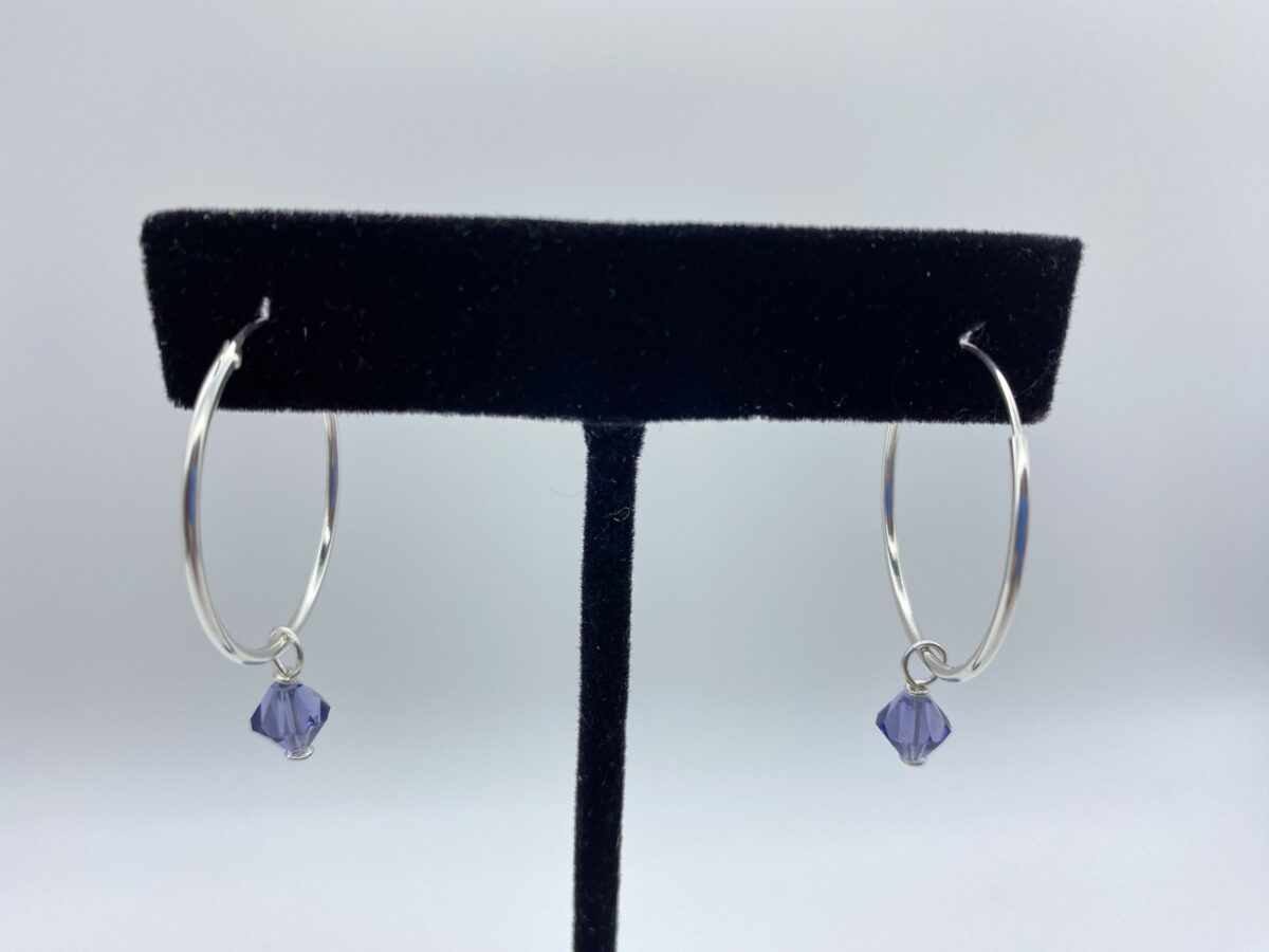 Sterling Silver 25mm hoops include 5 Crystal Dangles: Swarovskis -Olive, Tanzanite, Topaz, Blue Irredescent. Aqua Dangle is Czech crystal.