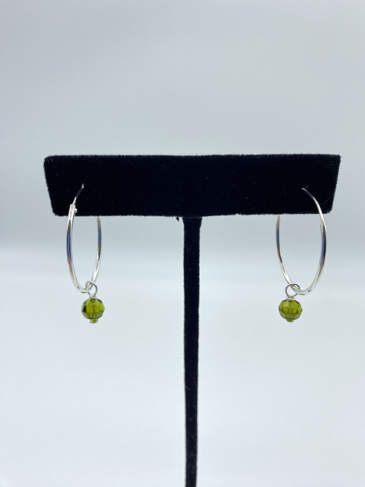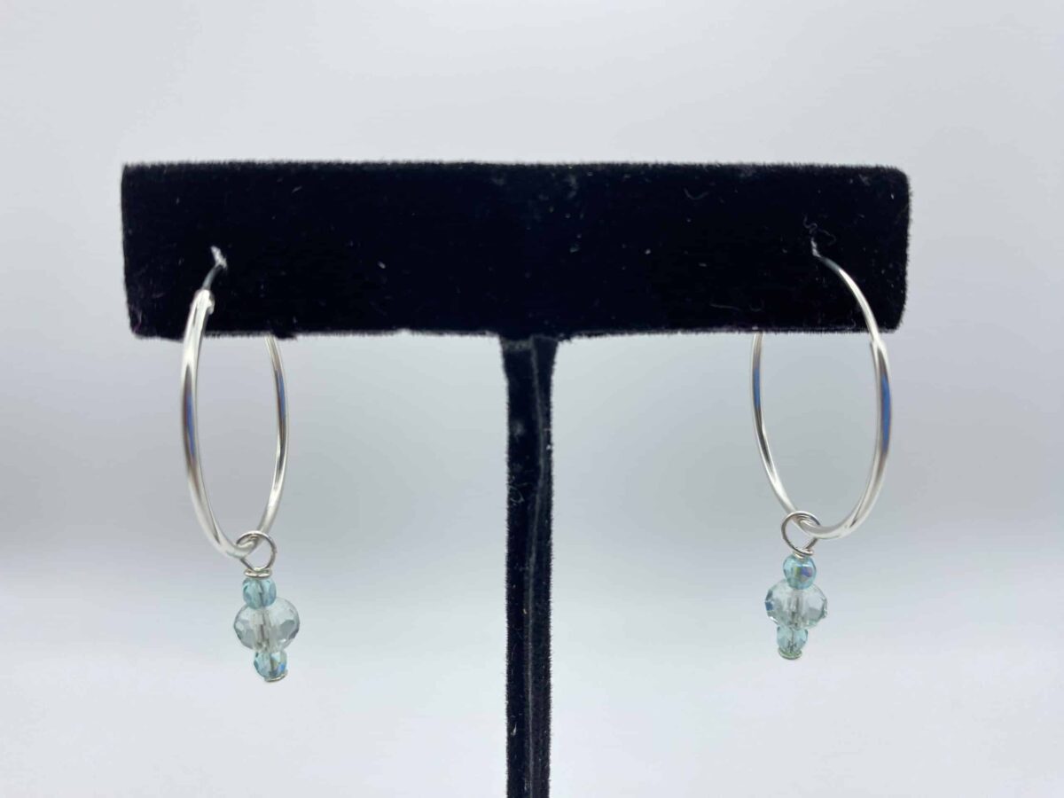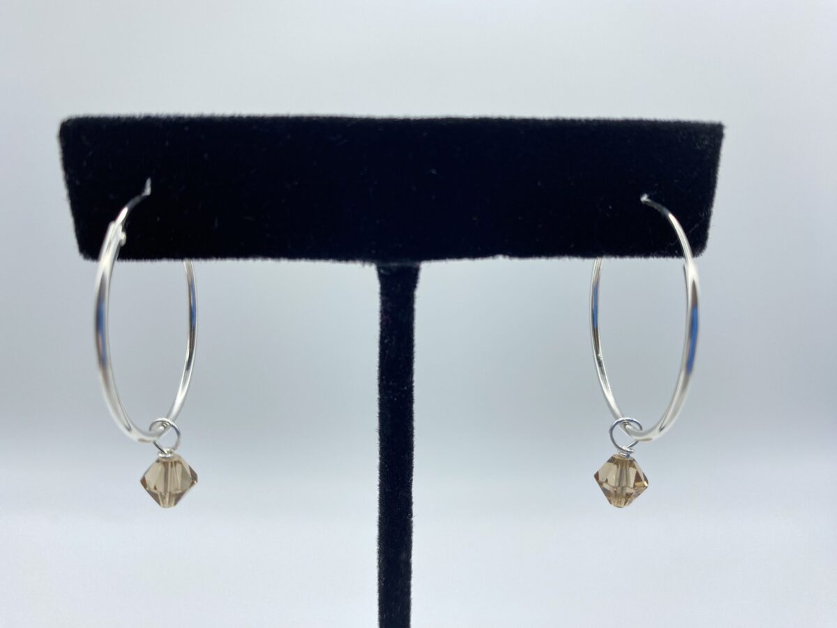 Sterling Silver 25mm hoops include 5 Crystal Dangles: Swarovskis -Olive, Tanzanite, Topaz, Blue Irredescent. Aqua Dangle is Czech crystal.